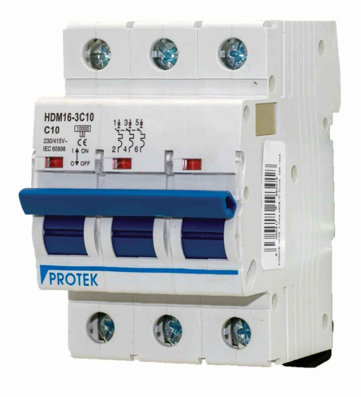 3 pole ‘C’ curve 10kA MCBs designed to fit all current Protek enclosures, consumer units and ‘A’ and ‘B’ boards.