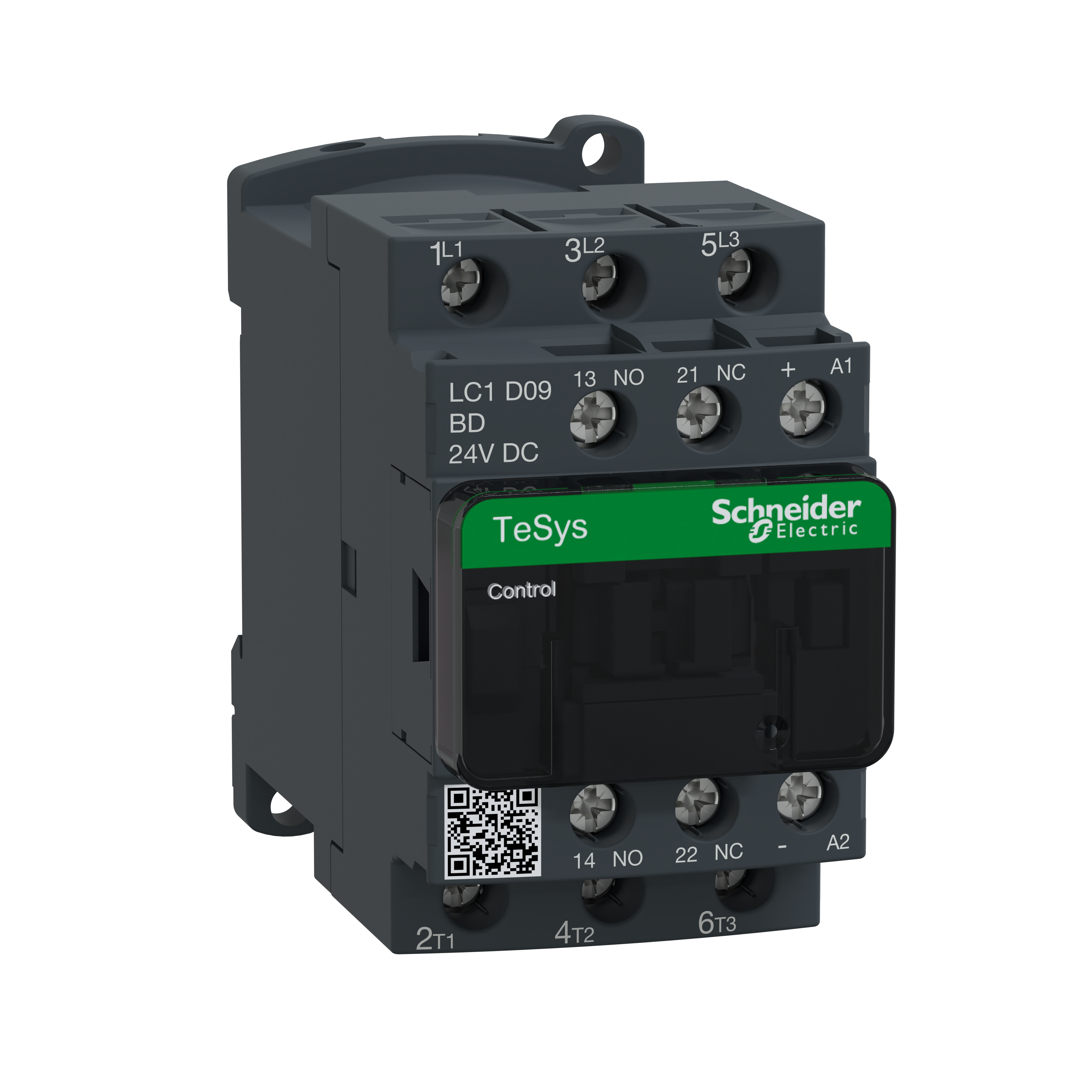 TeSys D contactor, 3 poles (3NO), for motor control applications up to 9A/690V AC-3/3e (4kW@400V). It provides a 24V DC coil with transient suppressor module, 1NO+1NC built-in auxiliary contacts (NC mirror certified), connection by screw clamp terminals. For operating rates until 3600 cycles/hour and environments until 60°C, it procures high reliability and durability to demanding applications. Compact (45mm width), DIN-rail mounting or screw fixing. Multi standards certified (IEC, UL, CSA, CCC, EAC, Marine), Green Premium compliant (RoHS/REACh).