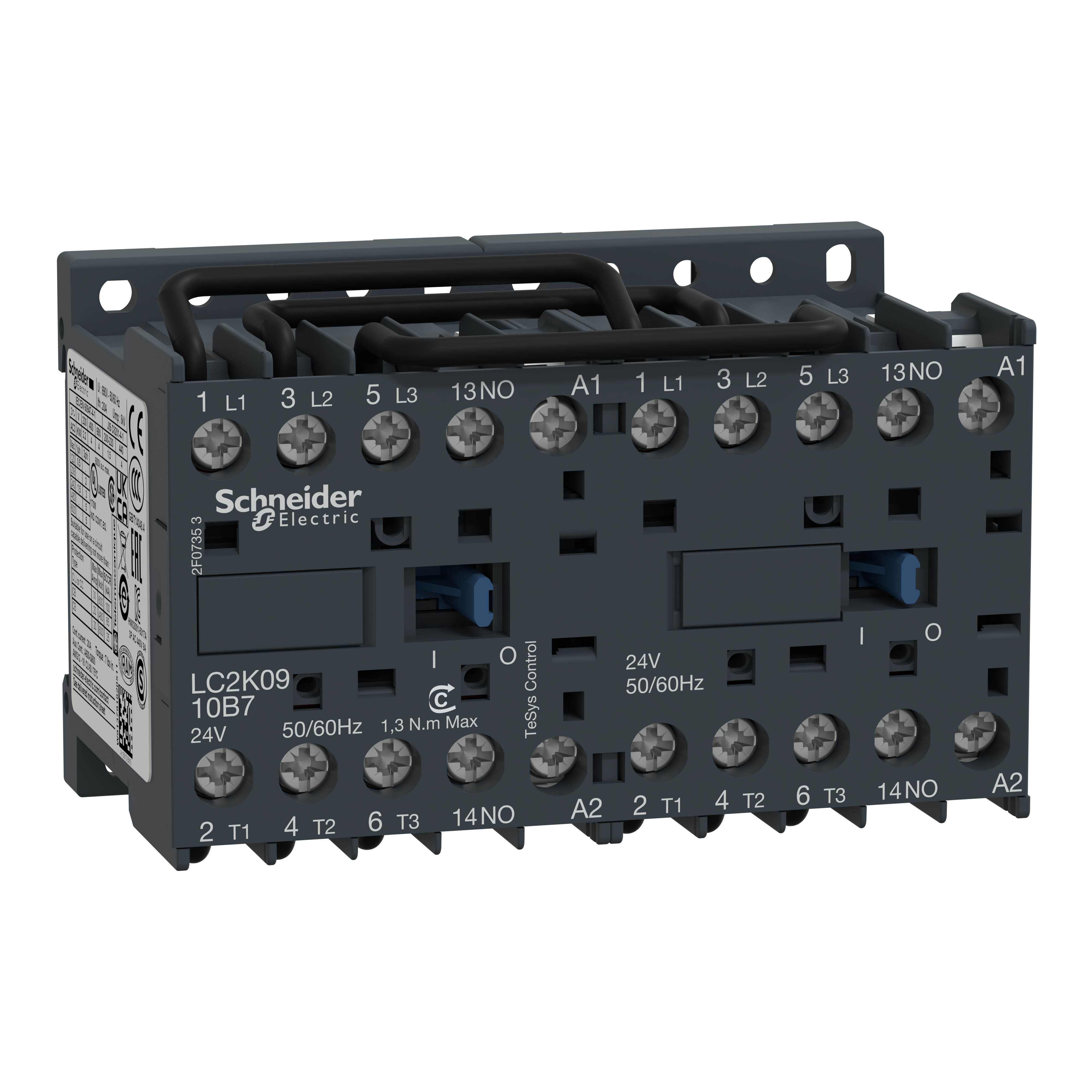 TeSys K reversing contactor, 3 poles (3NO), for motor control applications up to 9A/690V AC-3 (4kW@400V). It provides 24V 50/60Hz AC coils, 2NO built-in auxiliary contacts, connection by screw clamp terminals. For operating rates until 600 cycles/hour in AC-3 and environments until 50°C, it procures reliability and durability to standard applications. Compact (90mm width), DIN-rail mounting or screw fixing. With pre-wired reversing power connections, mechanical interlock (without electrical interlocking). Multi standards certified (IEC, UL, CSA, CCC, EAC), Green Premium compliant (RoHS/REACh).